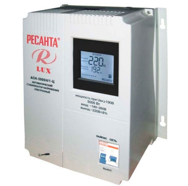 Le régulateur de tension extérieur de Resant, compatible 220 et 380 V, convient à une maison privée et à un chalet. La précision de stabilisation est de 8%, la puissance active est de 8 kW. Dispose d'un indicateur numérique, offre une protection contre les courts-circuits et les fluctuations de charge. Conçu pour des températures de 0 à +45 degrés. Le prix de l'appareil est de 8,3 à 13,5 mille roubles.