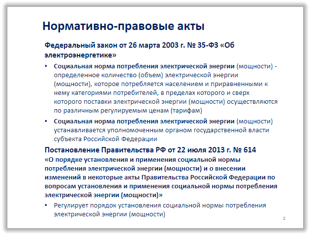 - Loi fédérale n° 614 "sur la procédure d'établissement et d'application d'une norme sociale pour la consommation d'électricité" ;