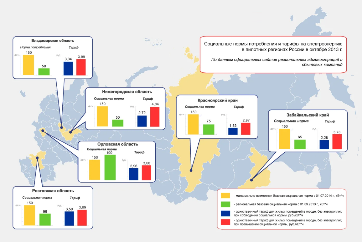 Les taux varient considérablement, ce qui est économiquement justifié. A titre d'exemple : le niveau de vie dans le Territoire de l'Altaï est le plus bas de la Fédération. Sur cette base, les résidents de cette région reçoivent le taux le plus élevé.De plus, il est pris en compte que la région n'est pratiquement pas alimentée en gaz ; les appareils électriques sont utilisés pour la cuisson et le chauffage.