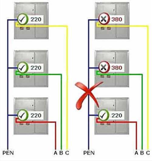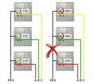 Le principe de la formation des circuits d'alimentation 380 volts repose sur le fait que chaque phase est connectée à "son propre" groupe de consommateurs (maisons, entrées ou appartements). Une coupure zéro dans les réseaux triphasés se produit lorsque la répartition des charges est perturbée, connectée, comme les enroulements du transformateur de la station, selon le schéma "en étoile" - ils doivent être connectés de manière uniforme. Avec une distribution correcte, les composants de courant sont mutuellement compensés et la valeur totale dans le fil neutre est proche de zéro. Par conséquent, le conducteur neutre est constitué d'une section plus petite que les fils de phase - théoriquement, il peut être totalement exclu, car le courant ne doit pas circuler ici.