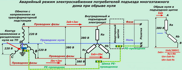 Les conséquences d'une coupure zéro dans un réseau triphasé sont parfois extrêmement dangereuses. Quel que soit le système de mise à la terre utilisé, lorsque le conducteur neutre grille, des potentiels élevés apparaissent dans les appartements connectés à un tel câble. En raison d'une forte polarisation, des tensions atteignant 380 volts apparaîtront sur certaines lignes de câblage. Sur les autres branches de l'entrée triphasée, au contraire, elles peuvent tomber à presque zéro.