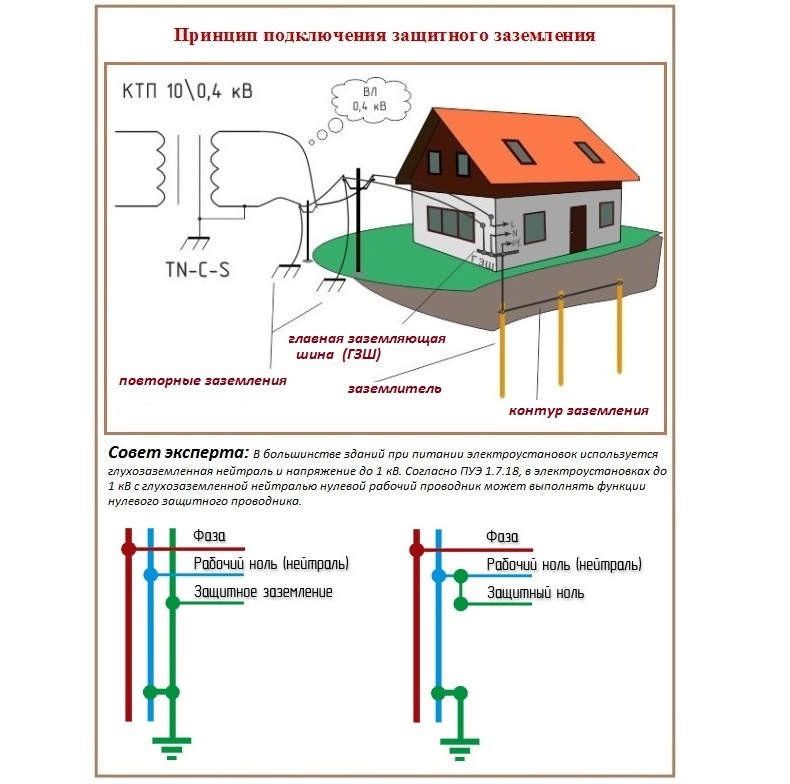 Dans les zones rurales et les bâtiments pavillonnaires privés, cette approche est très simple à mettre en œuvre. Il suffit d'équiper un dispositif de mise à la terre dans la zone adjacente à la maison et de le connecter via un bus en cuivre à un contact séparé monté dans la boîte de dérivation.