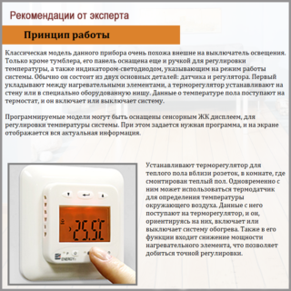 Le bon fonctionnement du thermostat est garanti par un thermostat et une sonde de température. Le principe de fonctionnement consiste à fixer la surface du sol ou l'air dans la pièce avec un capteur de température, après quoi l'alimentation électrique est bloquée par un thermostat. Une fois que la température est tombée à la valeur réglée, le système est remis en marche pour le chauffage. Grâce à de tels cycles, l'énergie est économisée et la température réglée dans la pièce est constamment maintenue.