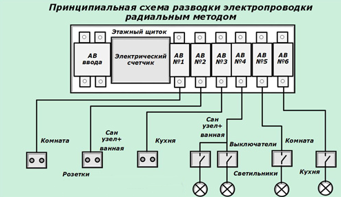 L'installation du réseau électrique pour les appartements multi-pièces s'effectue de manière similaire.Il est conseillé d'allouer une place pour un panneau d'introduction, dans lequel sont installés des commutateurs de paquets, à partir desquels une ligne relie chaque pièce.