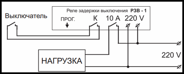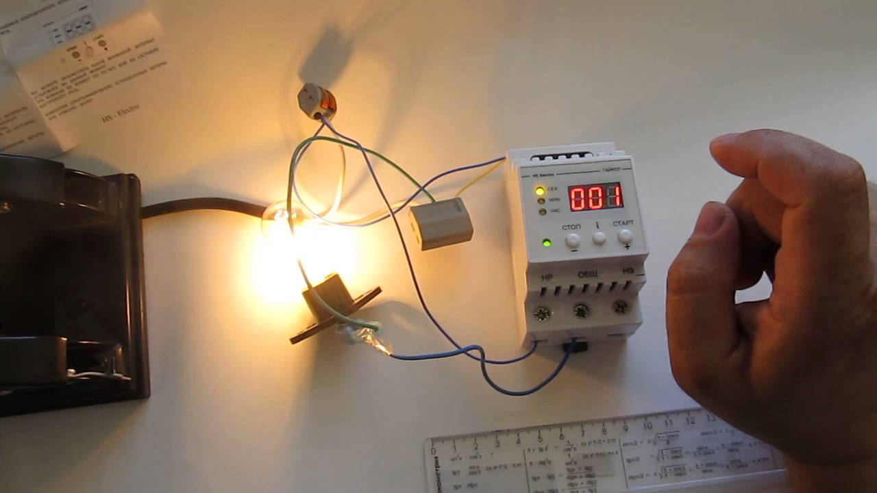 Le contact peut être représenté à la fois par un bouton poussoir momentané et un interrupteur conventionnel. Lors de la commutation, une ampoule ou toute autre charge est allumée et le temps programmé commence à compter. À la fin de la période spécifiée, l'appareil s'éteindra.