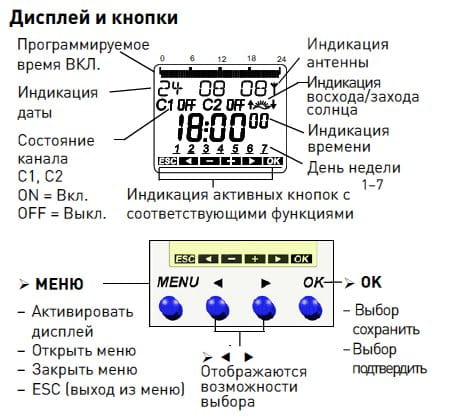 Le programme est réglé manuellement. L'intervalle de temps requis est défini après lequel le relais commutera le circuit électrique. Au besoin, vous pouvez programmer un jour précis de la semaine, un week-end ou un quart de travail. L'appareil a des paramètres qui expliquent sa fonctionnalité programmable :