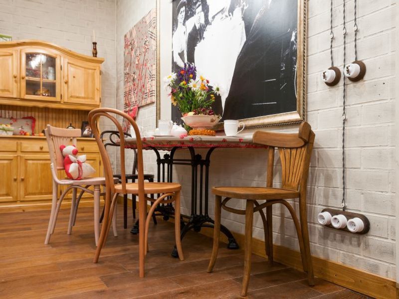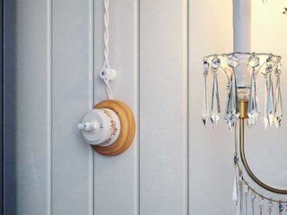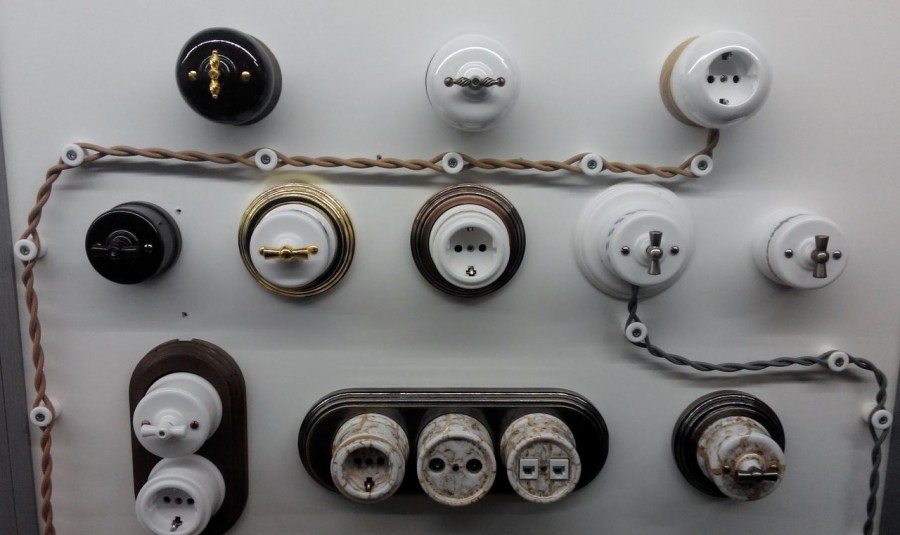 Les prises, les interrupteurs et les boîtes de jonction peuvent être installés et ordinaires - en plastique. L'essentiel est que les parois arrière soient constituées de matériaux non combustibles. Mais ils ne rentrent pas dans le style, alors ils achètent souvent des interrupteurs et des prises rétro en métal ou en porcelaine. Il existe des produits de production nationale, européenne et chinoise sur le marché. Les produits européens sont de meilleure qualité, mais chers. Les prises et interrupteurs domestiques ont un prix plus acceptable et une qualité d'un niveau décent, les appareils électriques chinois peuvent s'avérer peu fiables, leur qualité est instable, bien qu'il existe de bonnes options.