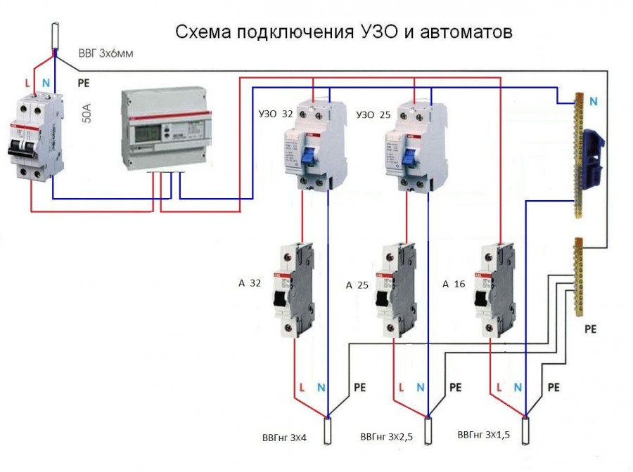 La particularité d'une telle connexion est qu'une règle unipolaire est nécessaire pour les machines automatiques, et une règle bipolaire pour un RCD. La condition pour le fonctionnement de ce dernier est la commutation conjointe de la phase et du zéro. Dans ce cas, ils partent du principe du maximum de possibilités, c'est-à-dire qu'ils choisissent un bus bipolaire, et les prises de terre tombant sur les machines sont simplement rabattues.