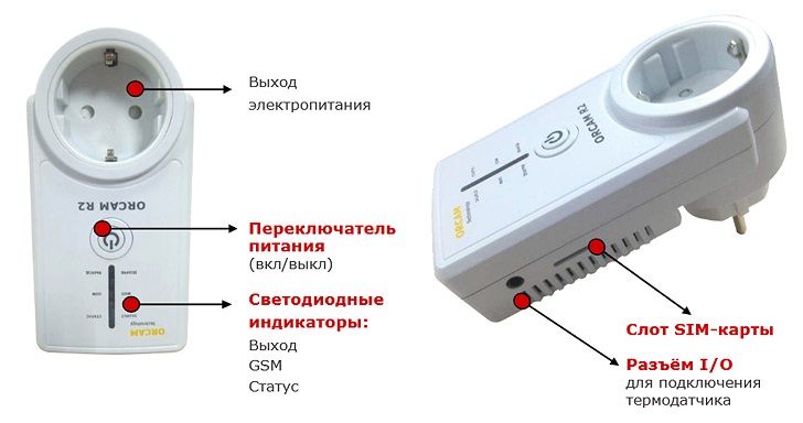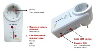 La prise SMS se compose d'une carte électronique et d'un module GSM intégré. Ces composants contrôlent l'appareil. La carte dispose d'un emplacement pour carte SIM et d'un support de batterie. Une fiche d'entrée et une prise Euro sont installées sur le corps. Selon le modèle, le panneau contient des boutons et des indicateurs LED.