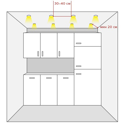 Les appareils d'éclairage ponctuels sont disposés de la manière suivante : 1 point lumineux pour 1,5-2 m2. Par exemple, dans une pièce d'une superficie de 15 m2, il est optimal d'intégrer 10 lampes. De plus, lors de la mise en place, vous devez prendre en compte les caractéristiques de puissance des lampes et le but de la pièce. Des sources lumineuses supplémentaires, telles que des lustres, peuvent être utilisées. Il faut faire attention aux dimensions des lampes : plus elles sont grandes, plus la distance doit être grande entre elles. La distance moyenne recommandée est de 30 cm.