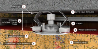 Lors de l'aménagement d'un éclairage sur un plafond suspendu, n'oubliez pas qu'il est interdit de fixer des objets à la surface de la toile. La toile est réalisée à partir d'une base en tissu ou d'un film PVC. Cette dernière option est utilisée beaucoup plus souvent. Un tel film n'a pas un niveau élevé de résistance et de résistance à la chaleur. Les appareils d'éclairage avec des lampes à incandescence traditionnelles ne peuvent pas être installés dans un plafond tendu, il y a un risque de faire fondre la zone à côté de la lampe.