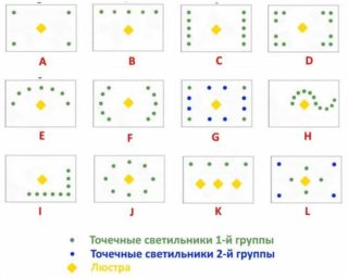 Dans les plafonds tendus, l'éclairage est monté selon les schémas principaux suivants: