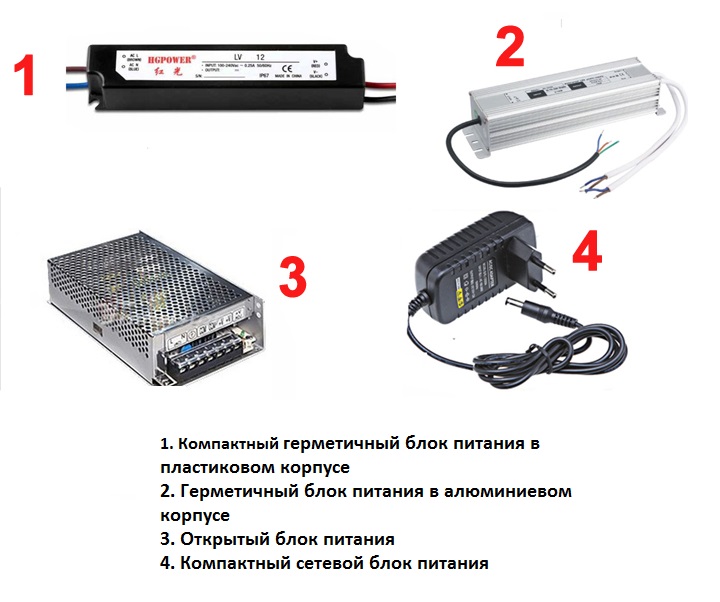 Ensuite, vous devez décider quel type d'alimentation pour la bande LED en termes de conception sera préférable. Les structures sont complètement ouvertes, semi-hermétiques et complètement scellées. Lors du choix, vous devez analyser dans quelle pièce la lampe fonctionnera - une zone de production, un salon ou une salle de bain. Le degré de protection maximal est requis si le luminaire est destiné à une utilisation en extérieur.