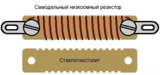À la maison, un tel shunt à faible résistance (R = 1 Ohm) est plus facile à réaliser seul, par exemple en enroulant un petit morceau de fil fin nichrome (section - 0,123 mm, résistivité - 7,94 Ohm / m, diamètre - 0,4 mm) 126 mm, sur une barre en fibre de verre.