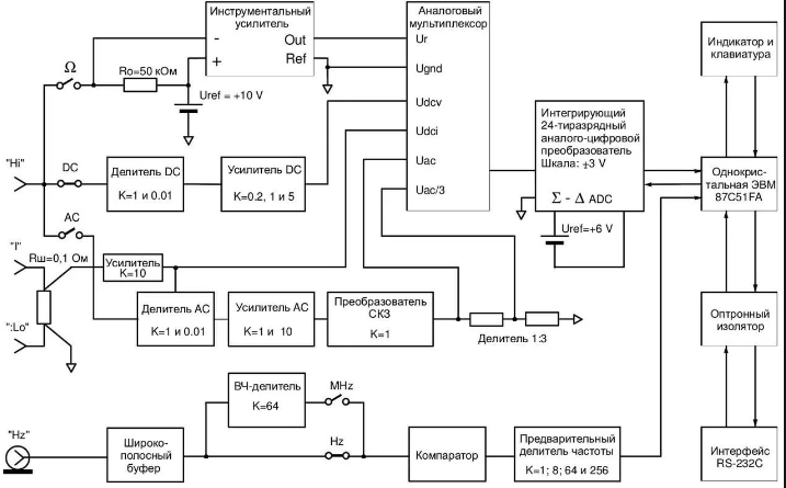 Le schéma fonctionnel est la base de tous les multimètres numériques et vous permet de mesurer les paramètres des circuits électriques AC et DC avec une grande précision.
