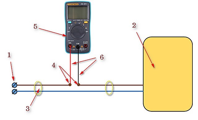 Pour mesurer le courant dans le circuit de l'appareil électrique connecté, le multimètre doit être connecté à la rupture de l'un des fils d'alimentation, comme indiqué sur le schéma.