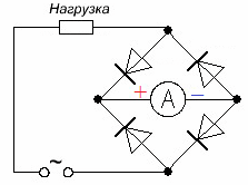 Parfois, le besoin de mesurer le courant dans le circuit CA peut survenir à un moment où il n'y a pas de multimètre avec une telle fonction à portée de main. Cependant, les radioamateurs ont trouvé un moyen de sortir de la situation en utilisant des testeurs fonctionnant uniquement sur courant continu pour mesurer le courant dans les circuits alternatifs.Il suffit de compléter le circuit électrique avec un pont de diodes en allumant un multimètre qui mesure les paramètres des circuits DC selon le schéma suivant :