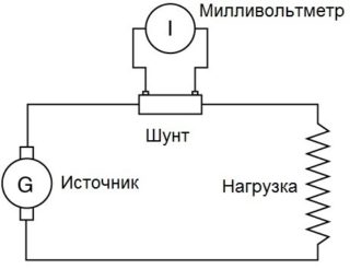 Un résultat similaire peut être obtenu si un shunt calibré spécial avec une résistance connue est inclus dans le circuit. Dans ce cas, le shunt est choisi de telle sorte que sa tension nominale coïncide avec la tension nominale de l'appareil de mesure.