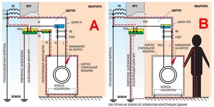 Une tension apparaît sur le corps des appareils électroménagers (le plus souvent un chauffe-eau ou une machine automatique). La raison réside dans l'endommagement de l'élément chauffant ou des ruptures dans l'isolation. Dans un circuit à trois ou deux fils pour connecter des équipements, le phénomène se manifeste de différentes manières: