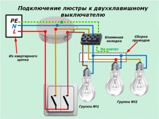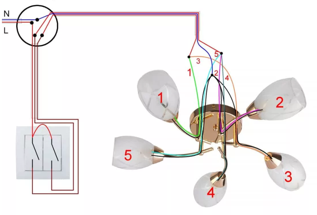 Lorsque des appareils qui ont plus de klaxons que le nombre de fils actifs sont connectés au réseau, les ampoules sont regroupées en groupes. Le nombre d'entre eux dans chacun est déterminé par la nécessité pratique et de conception.Il existe de nombreuses options, la plus intéressante est le schéma de connexion d'un interrupteur à deux boutons au lustre 1 + X, où 1 est l'éclairage de nuit ou de soirée en service, et X est le reste des lampes qui créent l'arrière-plan principal. Cependant, chaque propriétaire choisit lui-même la combinaison. La création de groupes est réalisée en torsadant des canaux avec isolation de la même couleur.