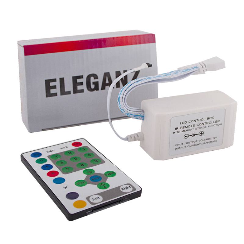 Avec une méthode de contrôle mécanique, une télécommande n'est pas incluse dans le kit. Vous pouvez régler la vitesse de décoloration d'une couleur et la décoloration d'une autre, la luminosité de la lueur peut être effectuée à l'aide d'un bouton ordinaire. Cet appareil est le plus simple dans sa mise en œuvre, doté du minimum de programmes.