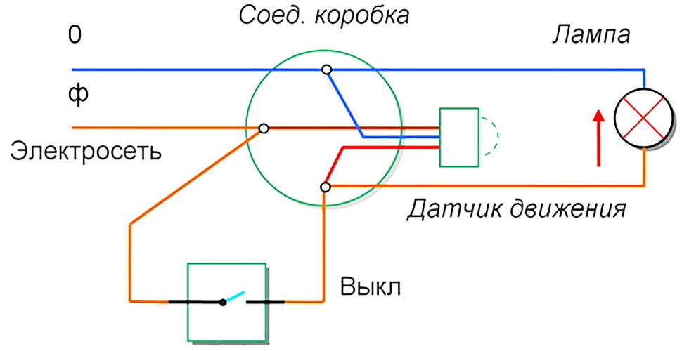 L'interrupteur est nécessaire s'il est nécessaire de désactiver le système de commutation automatique du circuit électrique. L'appareil est coupé dans la zone entre le détecteur de mouvement et l'alimentation. La connexion s'effectue via les conducteurs de phase d'entrée et de sortie - créant ainsi une connexion de dérivation.