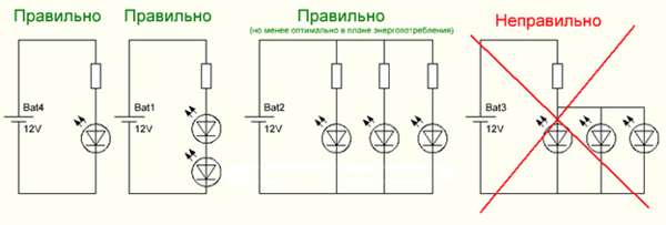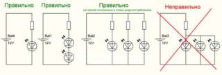 - Connexion parallèle avec une résistance. Une telle erreur menace la défaillance progressive de toutes les ampoules. Après tout, chacun a son propre courant de travail.