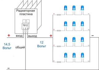 Si le maître connecte une LED 12 volts en guirlande, les lampes sont assemblées en chaîne. Dans ce cas, la cathode de chaque élément précédent est soudée à l'anode de chaque élément suivant.
