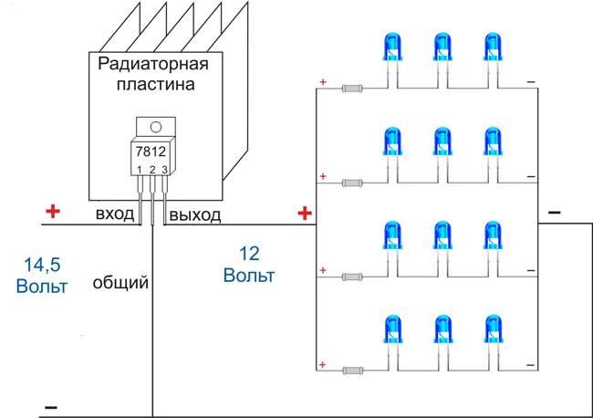 Chaque LED 12V ne doit être connectée qu'à une source d'alimentation de même tension. De plus, le MT doit avoir un courant de sortie stabilisé. La manière la plus simple et la plus souhaitable de connecter la LED à ces alimentations 12 V est :