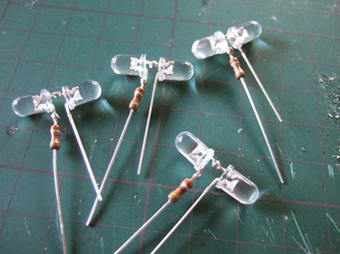 - Les ampoules sont connectées et soudées en respectant la polarité. La résistance est placée sur n'importe quelle partie de la chaîne.