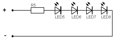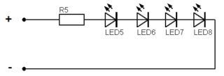 Les LED rouges et jaunes peuvent être connectées à la fois en cinq parties, car la chute de tension est inférieure à 2,2 volts.