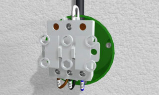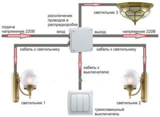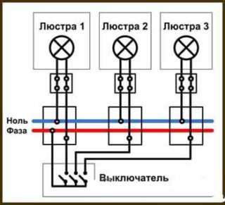 Les conducteurs triphasés partant des bornes supérieures du disjoncteur sont acheminés dans une goulotte de câbles vers la boîte de jonction. Dans celui-ci, ils sont déconnectés de la conception ultérieure de la branche vers le lustre. Chacun des bus d'alimentation est commuté de manière à ce que la tension passe à travers une ampoule distincte. Dans ce cas, il sera possible d'allumer les lampes par étapes - l'une après l'autre jusqu'à obtention d'un éclairage maximal.