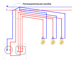 - L'utilisateur s'attend à allumer trois ampoules dans le lustre par étapes. Il est prévu d'utiliser une boîte de jonction pour la commutation.