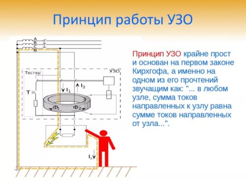 Dans le circuit, l'appareil agit comme le contrôleur principal de l'intensité du courant, qui y entre et en sort, respectivement. Avec une différence non nulle, une fuite est détectée, dont un signal est envoyé au RCD et en moins d'une seconde, le circuit électrique est coupé.