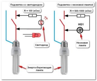Le schéma de connexion a la même résistance élevée, quel que soit le type d'indicateur utilisé - une lampe néon ou une LED. Ce chiffre est fourni par une résistance de limitation.