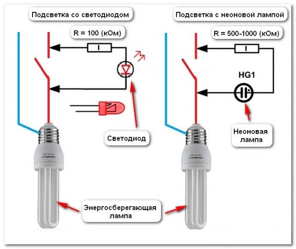 - Vous pouvez également connecter une lampe à incandescence ordinaire avec une version à économie d'énergie. Dans ce cas, le courant circulant dans le circuit indicateur traversera le filament. L'inconvénient de cette méthode est la grande quantité d'électricité consommée.