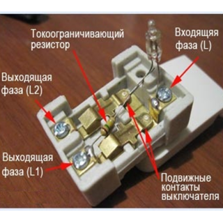 Une résistance de limitation de courant est connectée en série avec la lampe au néon ou la LED dans le commutateur. Il est installé afin de réduire le courant à des paramètres optimaux. Les LED et les lampes au néon nécessitent un ampérage différent, de sorte que les résistances sont réglées à des valeurs différentes.