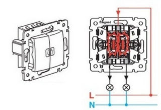 Dans la mise en œuvre, la méthode est un peu plus compliquée, puisqu'il faut trouver un conducteur de phase et le connecter à la prise requise. Le double interrupteur a trois contacts de connexion. La phase est le plus souvent affichée en marron ou en rouge, et à partir du dispositif d'éclairage la couleur des fils peut être la même. Avant le raccordement, la présence de tension de phase est vérifiée, si nécessaire, le fil est marqué.