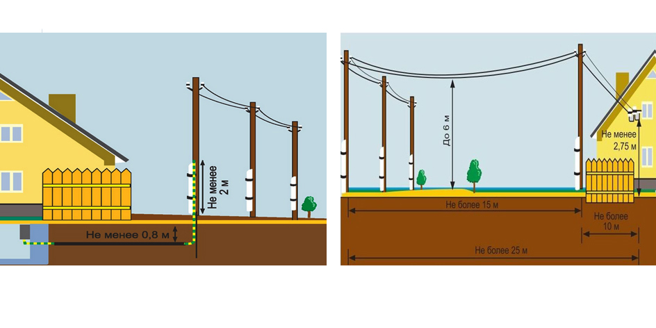 - la distance du câble entre les supports de la ligne de transport d'électricité et le mur est de 10 cm, s'il s'agit d'une maison en bois et de 5 cm des surfaces en briques ;