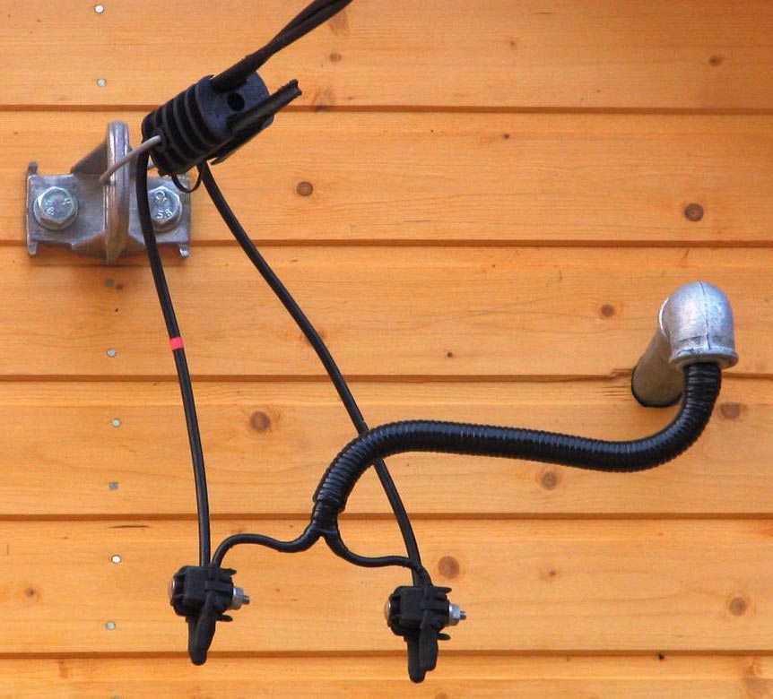 Lors de la pose à travers le toit, un coude vers le bas du tuyau est utilisé, ou un jars, dans lequel les fils électriques sont fixés avec des isolants en céramique. Afin de réduire la longueur des câbles, le câblage est réalisé au plus près du tableau de distribution.