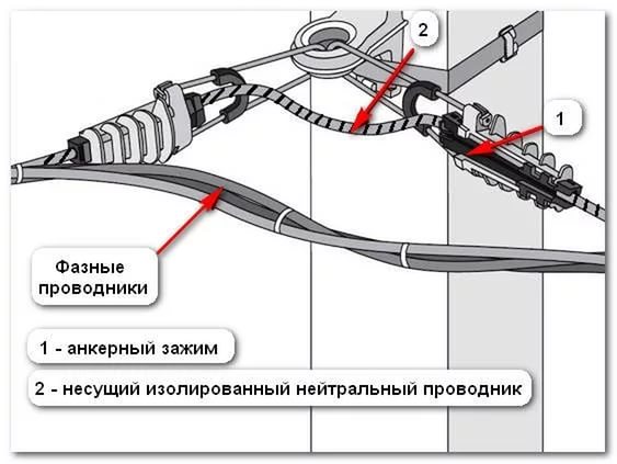 SIP et VVGng sont connectés à l'aide de tiges de renfort standard, de pinces de perçage ou d'autres éléments à proximité du point d'entrée. Il est inacceptable d'utiliser un fil isolé autoportant dans une zone résidentielle - il prend en charge les processus de combustion.