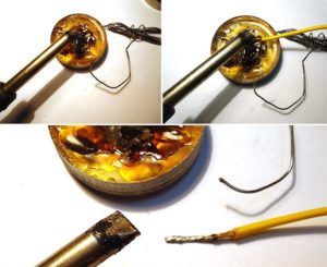Le fil de cuivre est soigneusement dénudé, puis plongé dans la colophane. Le spécialiste fait fondre quelques gouttes de soudure et pour l'étamage le fil est plongé dans la masse fondue. La procédure est effectuée avec des mouvements doux et réguliers.