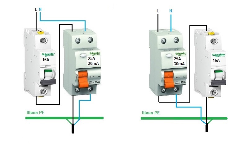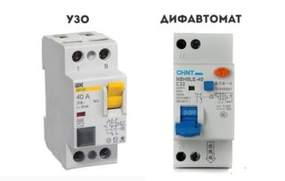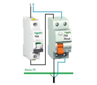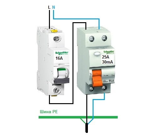 Un dispositif d'arrêt de protection est nécessaire pour se protéger contre les surcharges, les courts-circuits. En raison de l'absence de réaction aux surintensités, il est installé en combinaison avec un difavtomat. Les schémas de connexion permettent d'installer les appareils dans n'importe quel ordre. La seule condition est le choix de la dénomination appropriée.