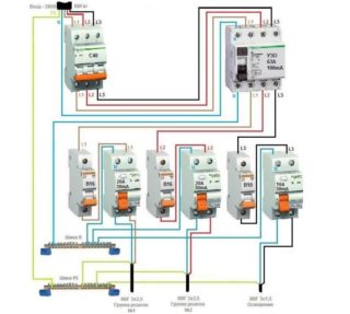 A partir de la première entrée automatique, la tension ira au deuxième appareil triphasé le long des bornes supérieures. À partir du même appareil, une phase ira à un RCD monophasé, la seconde à la suivante.