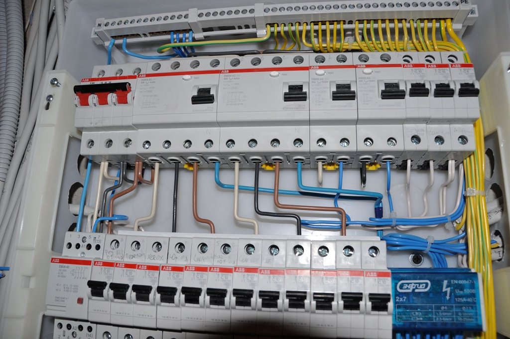 Le bus de mise à la terre est commun, mais il doit être installé séparément. Trois phases avec un zéro de travail sont amenées au dispositif d'entrée. Il est connecté à un zéro commun, puis dévié vers tous les DDR. Après l'appareil n ° 1, il passe à une charge triphasée, après les autres appareils monophasés - à chaque bus.