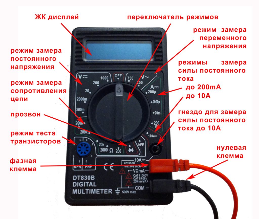 Avant de commencer le travail, il est important de positionner correctement les sondes : noir - COM, rouge - jusqu'à 200mA à VΩmA, au-dessus de 200mA à 10ADC.