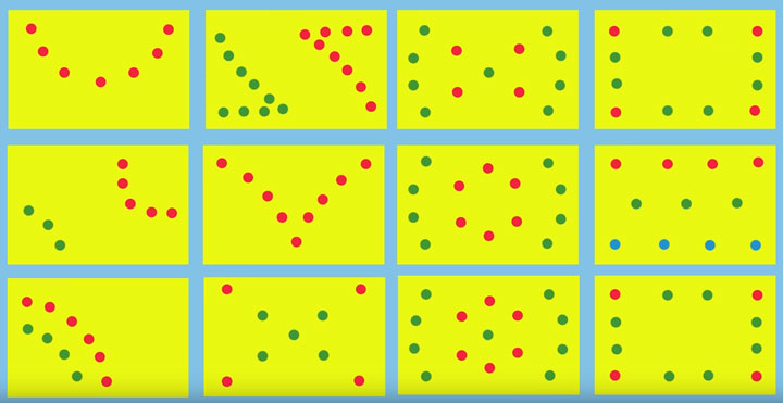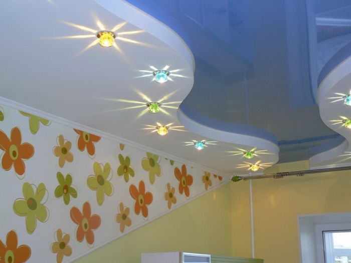 Les spots peuvent être placés en ligne droite sur une ou plusieurs rangées, selon la largeur de l'espace. Vous pouvez installer des sources lumineuses en arc, le long du périmètre, en cercle. La disposition asymétrique, qui peut être créée selon vos besoins, semble également intéressante.