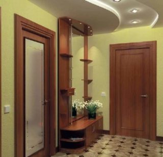 Il est optimal d'utiliser un plafond suspendu blanc brillant avec de petits spots dans le couloir. Les rayons se disperseront, faisant apparaître les murs plus larges et le plafond plus haut.