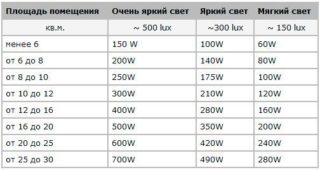 Des calculs similaires sont effectués pour les lampes qui doivent être installées dans un lustre. Selon les données calculées ci-dessus, il représente 40 watts de puissance totale. S'il y a 5 cornes dans le modèle de lustre sélectionné, 5 lampes de 8 W chacune sont achetées. Si le lustre a trois bras, le résultat de division exact donnera 13,3 watts par lampe. Étant donné que de tels modèles ne sont pas disponibles, il convient de privilégier les appareils d'éclairage de 15 W.