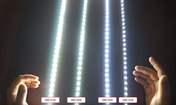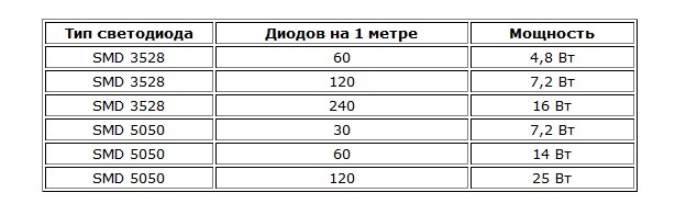 La quantité de flux lumineux de la bande LED est proportionnelle au nombre d'éléments émetteurs installés dessus, par mètre linéaire. Selon la classification existante, ce nombre est choisi parmi la gamme suivante : unités de 30, 60, 90, 120 et 240 points. La tension d'alimentation pour les rubans basse tension est de 12 ou 24 volts. Les valeurs plus élevées sont extrêmement rares.